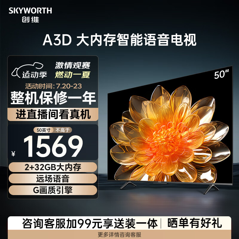 创维电视50A3D 50英寸电视机2+32G远场语音G画质引擎智能投屏4K超高清护眼屏价格:1569.00元!