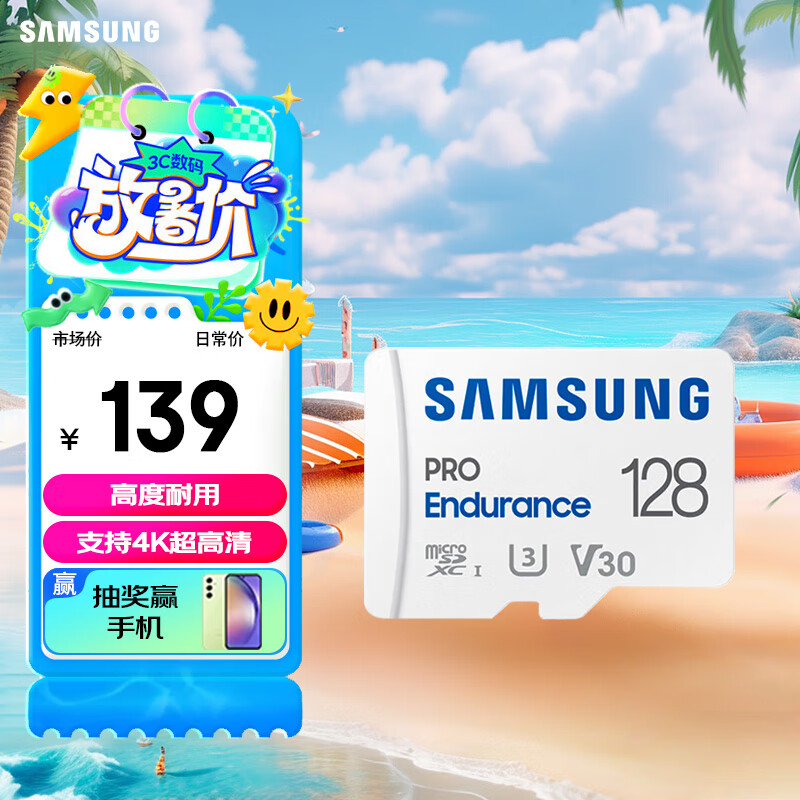三星(SAMSUNG)128GB TF(MicroSD)存储卡 Endurance耐久卡 U3 V30 行车记录仪 安防监控摄像头专用卡 读速100MB/s价格:139.00元!