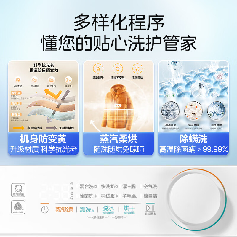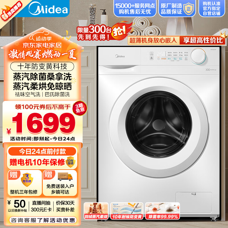 美的(Midea)滚筒洗衣机全自动家用 MD100V11F 10公斤洗烘一体洗衣机排名前十名 巴氏除菌洗 蒸汽柔烘 简尚价格:1799.00元!