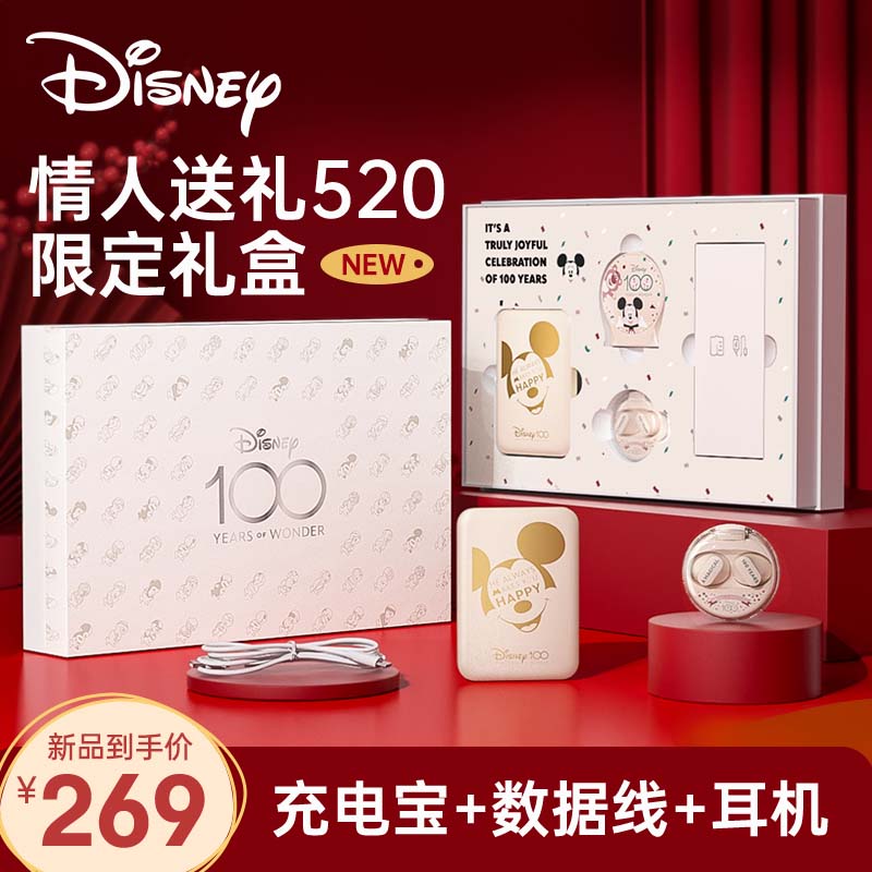 迪士尼(DISNEY)【限量礼盒装】蓝牙耳机+无线充电宝+三合一充电线三件套送男女生情人节表白神器礼物QS-L01价格:299.00元!