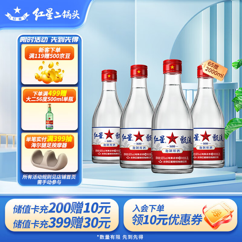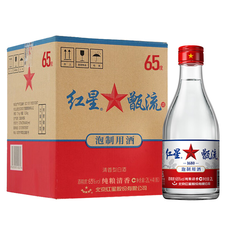 红星二锅头甑流 清香型白酒 65度 2000ml*4瓶 整箱装 浸泡酒价格:556.00元!