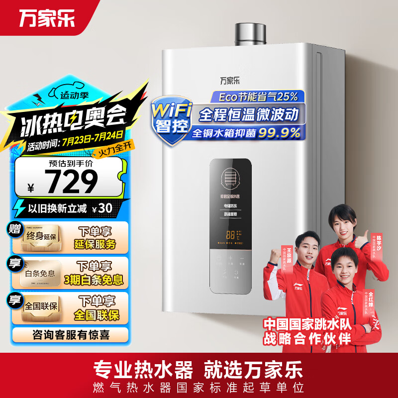 万家乐13升燃气热水器天然气智能变升节能一键智能恒温微波动厨房洗防冻 JSQ26-13DP1(F)以旧换新价格:729.00元!