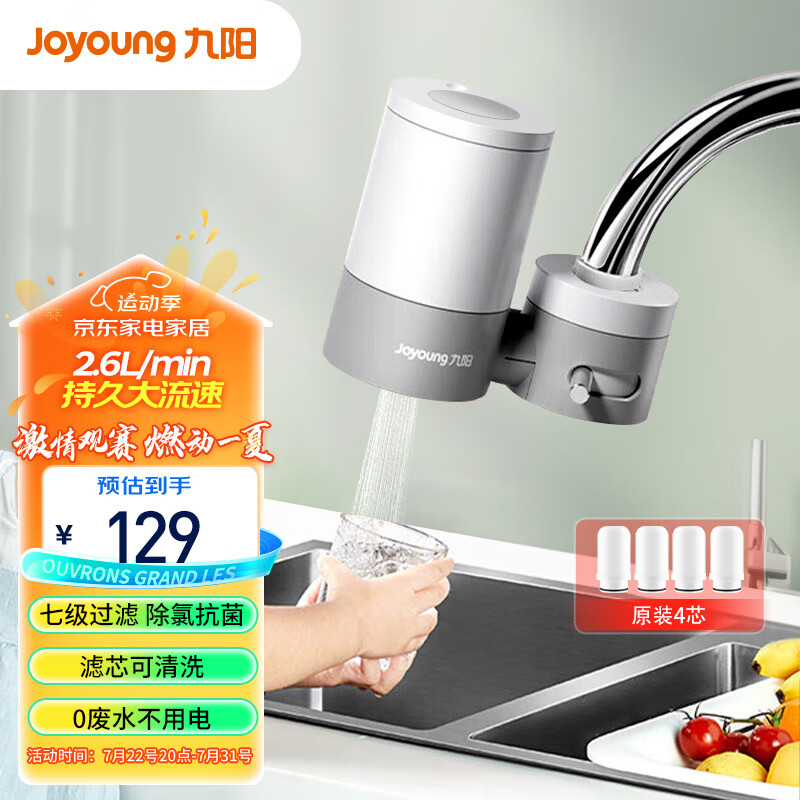 九阳(Joyoung)净水器水龙头过滤器厨房自来水过滤器除余氯双出水 1机4芯套装 T28价格:114.00元!