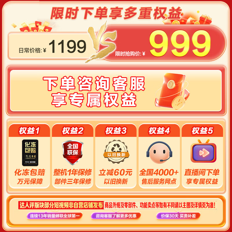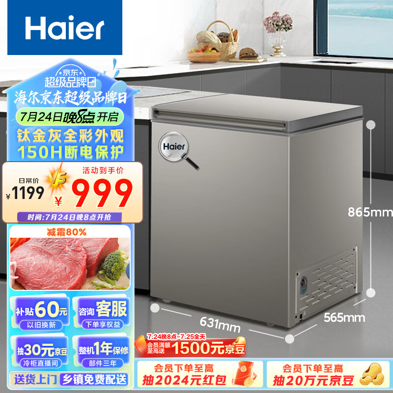 海尔(Haier)142升低霜家用商用冷藏柜冷冻柜小冰柜小型冷柜小冰箱海尔冰柜BC/BD-142GHCD以旧换新价格:999.00元!