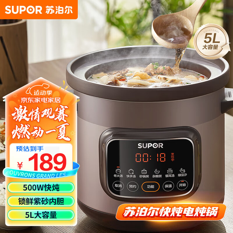苏泊尔(SUPOR)快炖电炖锅 电砂锅 电炖盅 炖汤盅煲汤锅 紫砂锅 燕窝炖盅 煮粥神器 熬粥锅 5L容量 DG50YC872价格:189.00元!