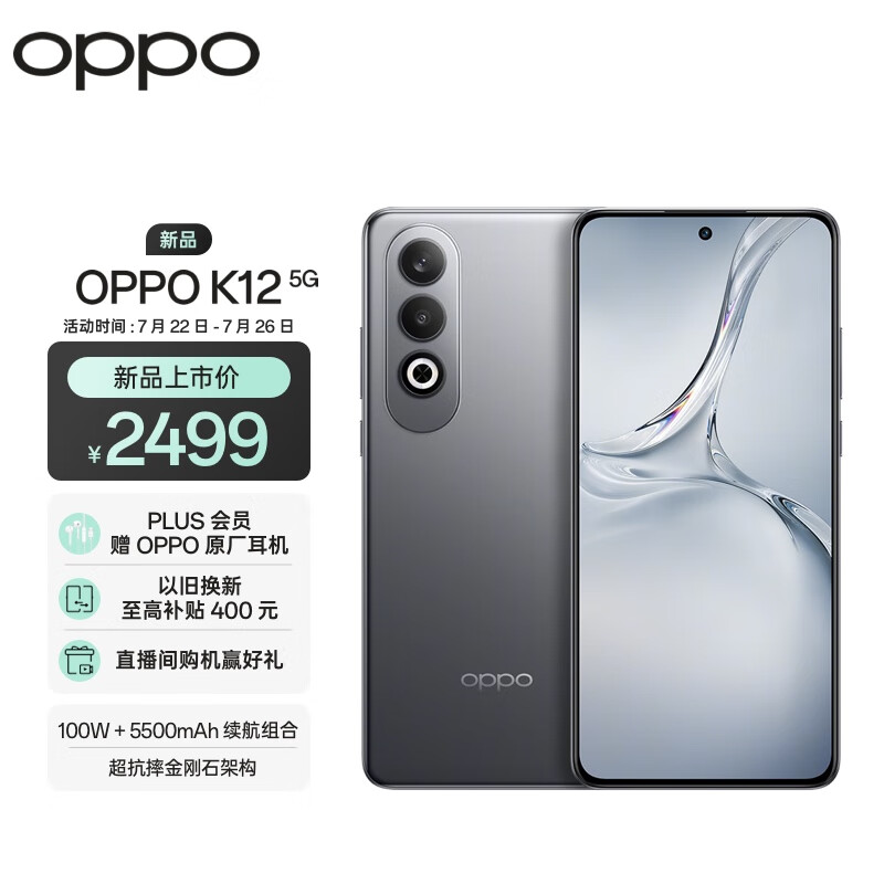 OPPO K12 5G 12GB+512GB 星夜 100W+5500mAh续航组合 第三代骁龙7旗舰芯 直屏新款游戏智能学生 AI手机价格:2499.00元!
