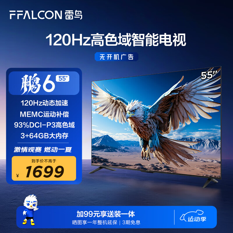 FFALCON雷鸟 鹏6 24款 电视机55英寸 120Hz动态加速 高色域 3+64GB 智能游戏液晶平板电视以旧换新55S375C价格:1699.00元!