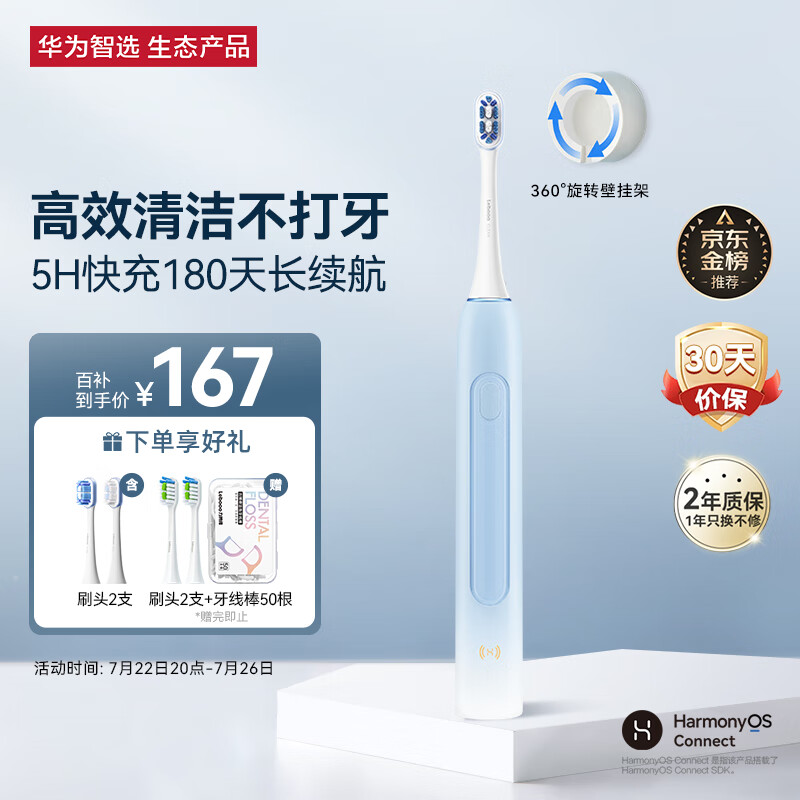 华为智选力博得电动牙刷 智能声波牙刷3 送男友送女友生日礼物 深度清洁亮白 180天长续航 优漾3 冰晶蓝价格:169.00元!