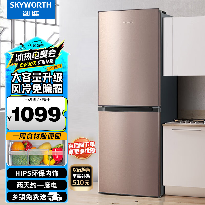 创维 (SKYWORTH)215升两门双门风冷冰箱节能低噪冰箱家用小型电冰箱小巧不占地BCD-215WY(N)以旧换新价格:1099.00元!