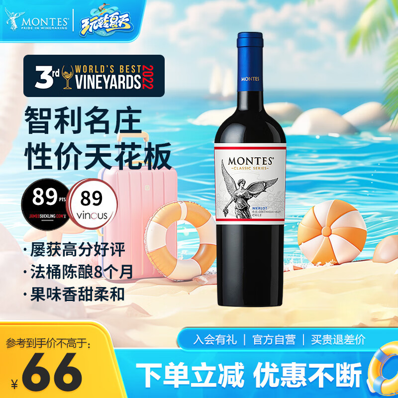 MONTES蒙特斯经典梅洛红酒葡萄酒750ml日常口粮酒婚礼宴请智利原瓶进口价格:66.00元!