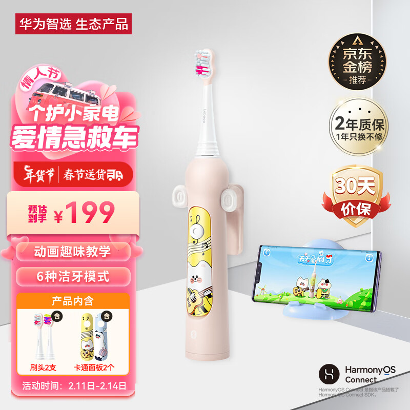 华为智选力博得智能儿童电动牙刷 新年礼物 声波震动儿童款 食品接触级材质 宝宝电动牙刷3-6-12岁 甜美粉价格:229.00元!