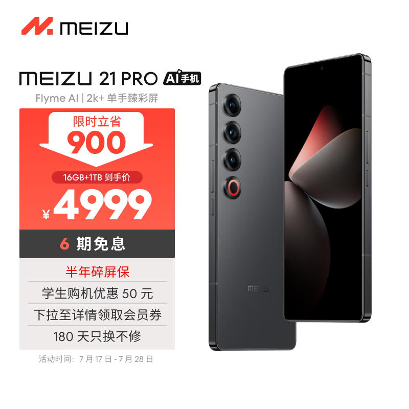 魅族(MEIZU)21 PRO AI旗舰手机 2k+臻彩屏 广域超声波指纹 5000万超稳AI影像 第三代骁龙8 16+1TB 耀夜黑价格:4999.00元!