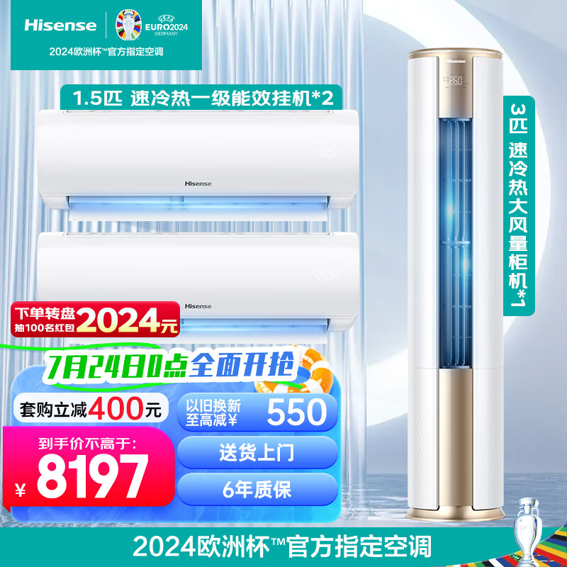 海信(Hisense)速冷热空调套装 二室一厅 新一级能效变频超大风量客厅柜机卧室家用挂机(1.5匹*2+3匹)价格:8197.00元!