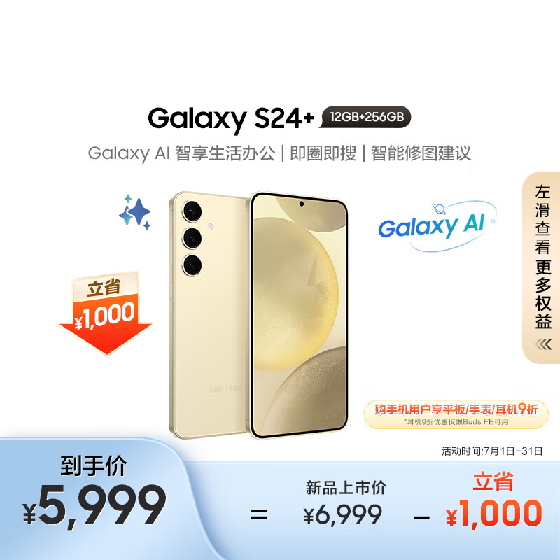 三星(SAMSUNG)Galaxy S24+ AI手机 智享生活办公 5000万像素 拍照手机 第三代骁龙8 游戏手机 12GB+256GB 浅珀黄价格:5999.00元!