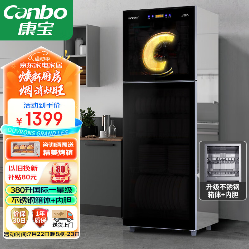 康宝(Canbo)消毒柜家用 消毒碗柜 立式大容量 消毒柜商用 一奶瓶餐具不锈钢臭氧紫外线消毒柜ZTP380X-S2价格:1499.00元!