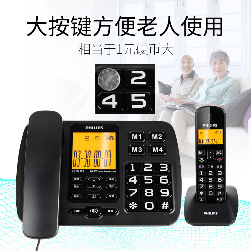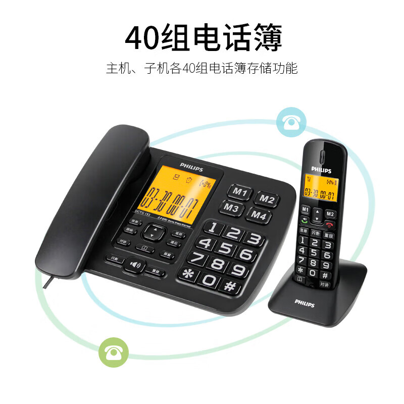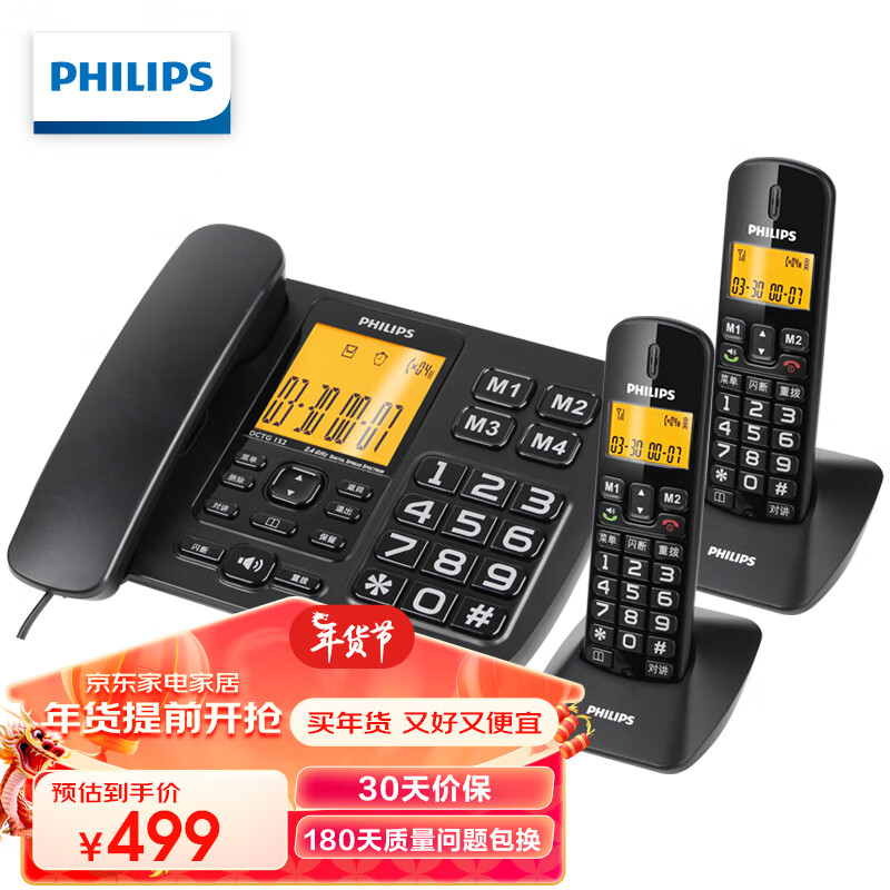 飞利浦(PHILIPS)无绳电话机 固定座机 子母机 家用办公 一键拨号 三方通话 DCTG152一拖二 (黑色)价格:499.00元!