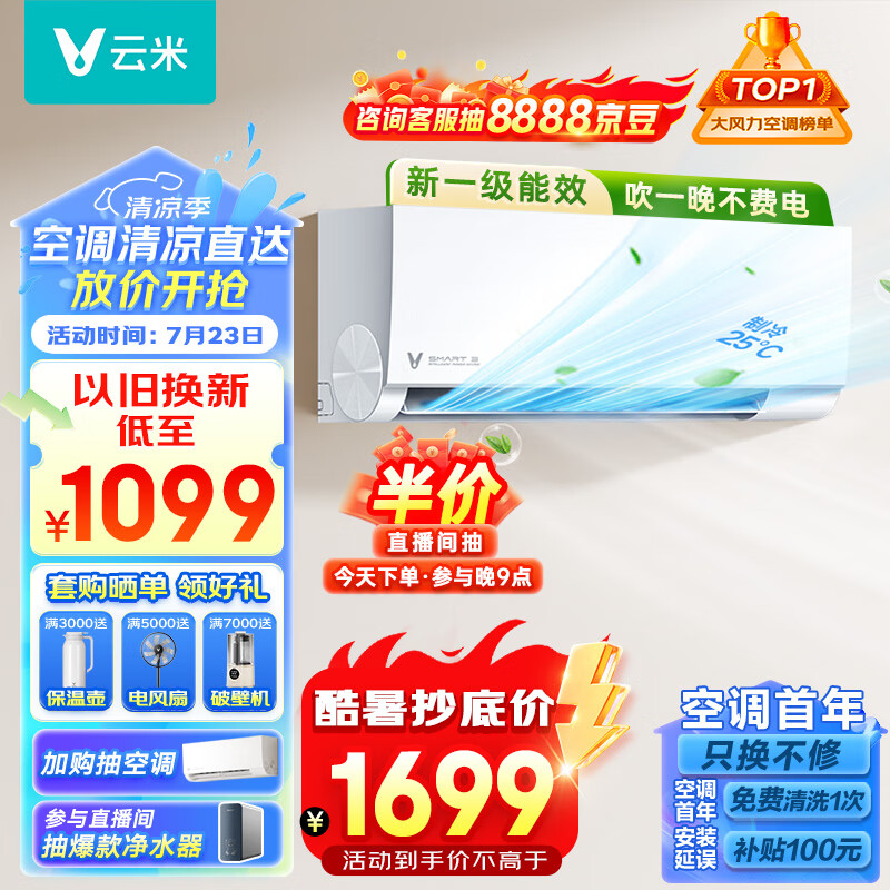 云米(VIOMI)空调1.5匹新一级能效挂机客厅卧室挂式家用空调冷暖变频KFRd-35GW/Y3PQ7-A1以旧换新价格:1899.00元!