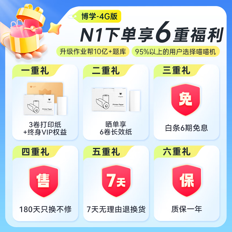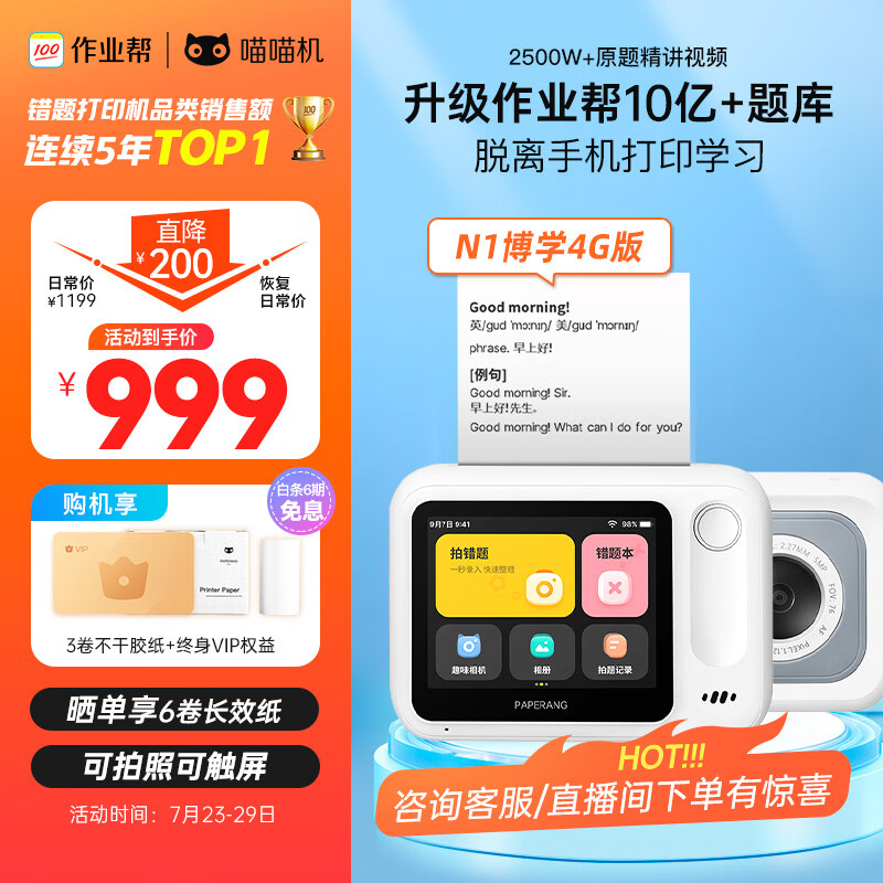喵喵机N1【博学版】高清灰阶作业帮学生错题整理家用热敏可拍照可触屏智能学习错题打印机 4G版价格:1029.00元!