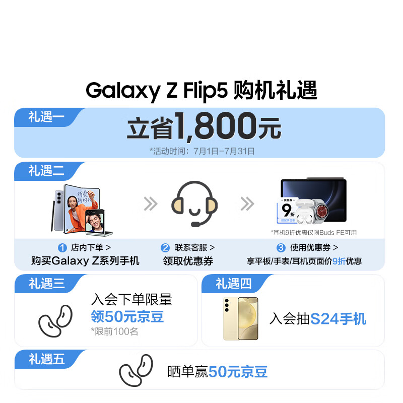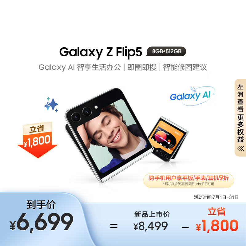 三星(SAMSUNG)Galaxy Z Flip5 AI手机 智能外屏 掌心折叠 同声翻译 智能修图摄像 8GB+512GB 云影灰 折叠屏手机价格:6699.00元!