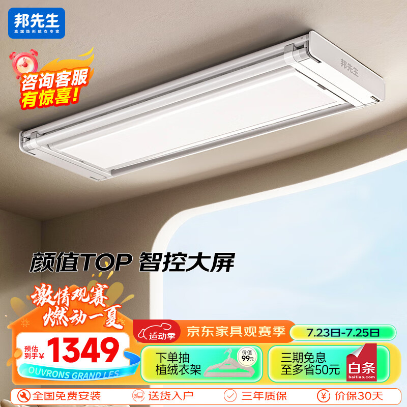邦先生超薄隐形嵌入式电动晾衣架全自动智能升降阳台消毒凉晒衣机M22C白价格:1349.00元!
