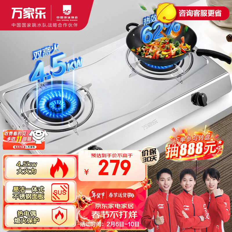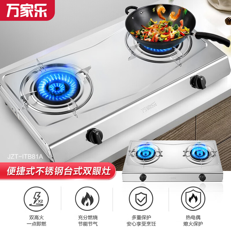 万家乐燃气灶 4.5kW大火力 不锈钢台式灶燃气灶双灶 家用台式燃气灶具JZT-ITB81A天然气价格:279.00元!