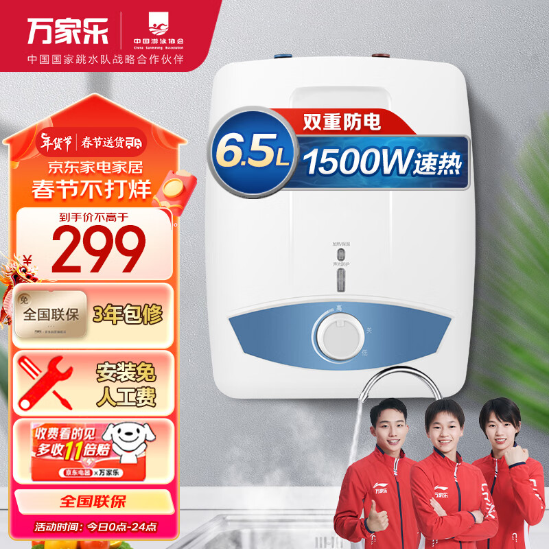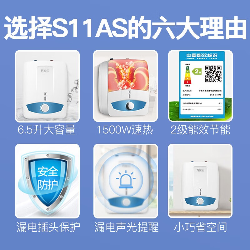 万家乐 6.5升大容量 三层内胆 上出水 1500W速热小厨宝 双重安防 电热水器D6.5-S11AS价格:299.00元!