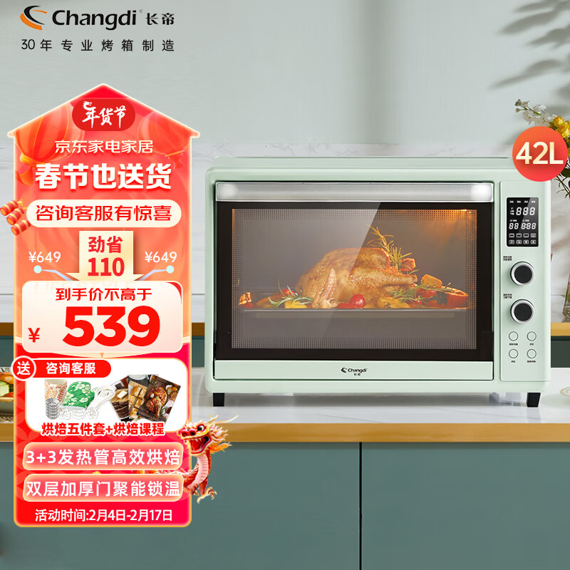 长帝(changdi)家用多功能电烤箱42升大容量 独立控温 搪瓷内胆智能菜单热风循环旋转烤叉 猫小易价格:539.00元!