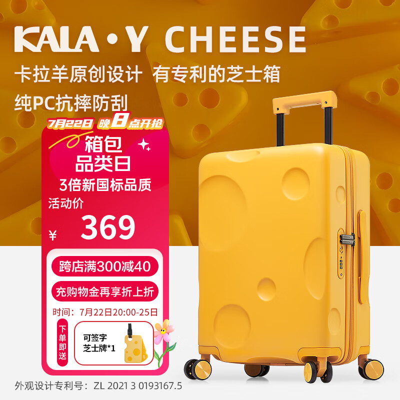卡拉羊芝士箱防刮纯PC行李箱20英寸可登机女拉杆箱男旅行箱8109芝士黄价格:469.00元!