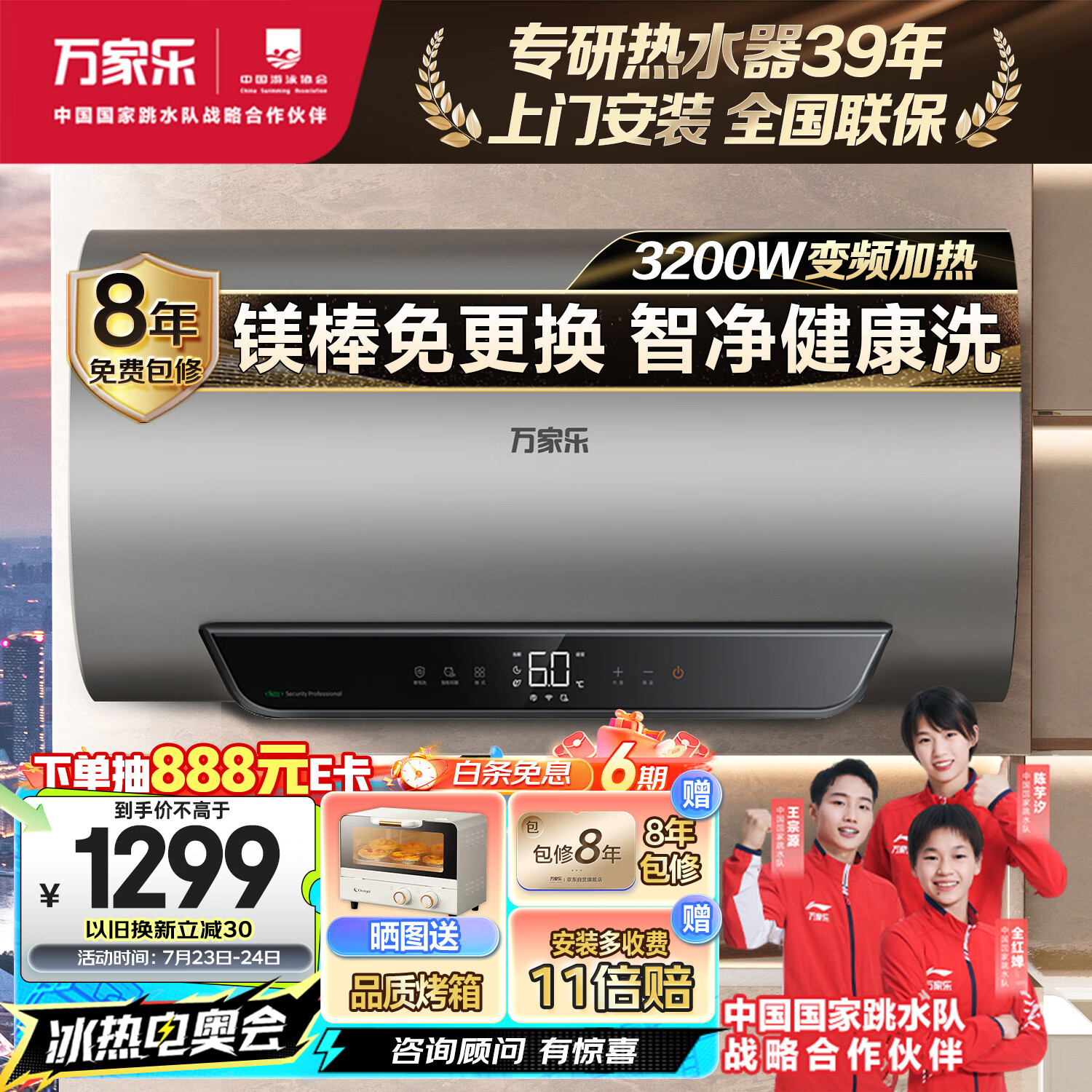 万家乐80升电热水器3200W速热 家用储水式 AI智能灭菌 镁棒免换 出水断电 一级能效D80-FW5 以旧换新价格:1399.00元!
