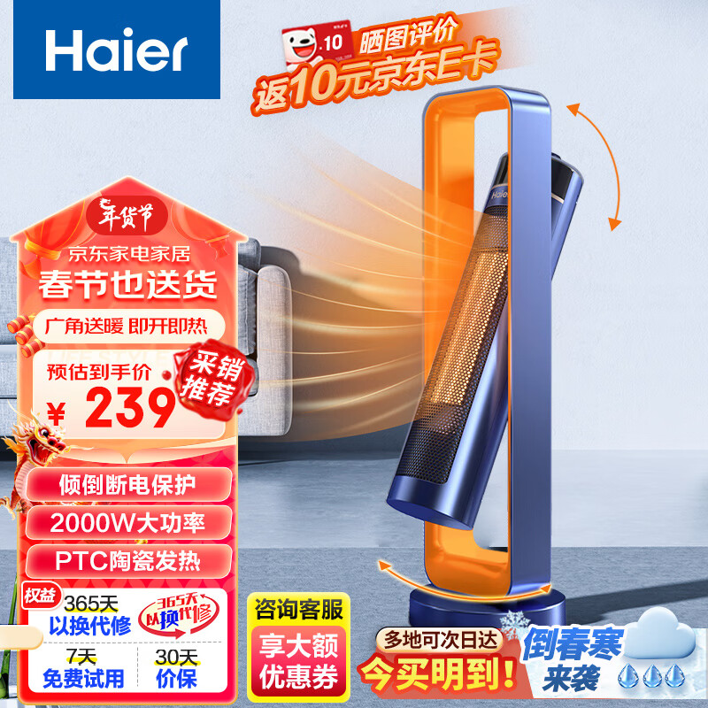 海尔取暖器家用暖风机立式电暖器电暖风浴室热风机摇头暖风扇省电节能烤火炉速热电暖气HNF-2017B价格:265.50元!