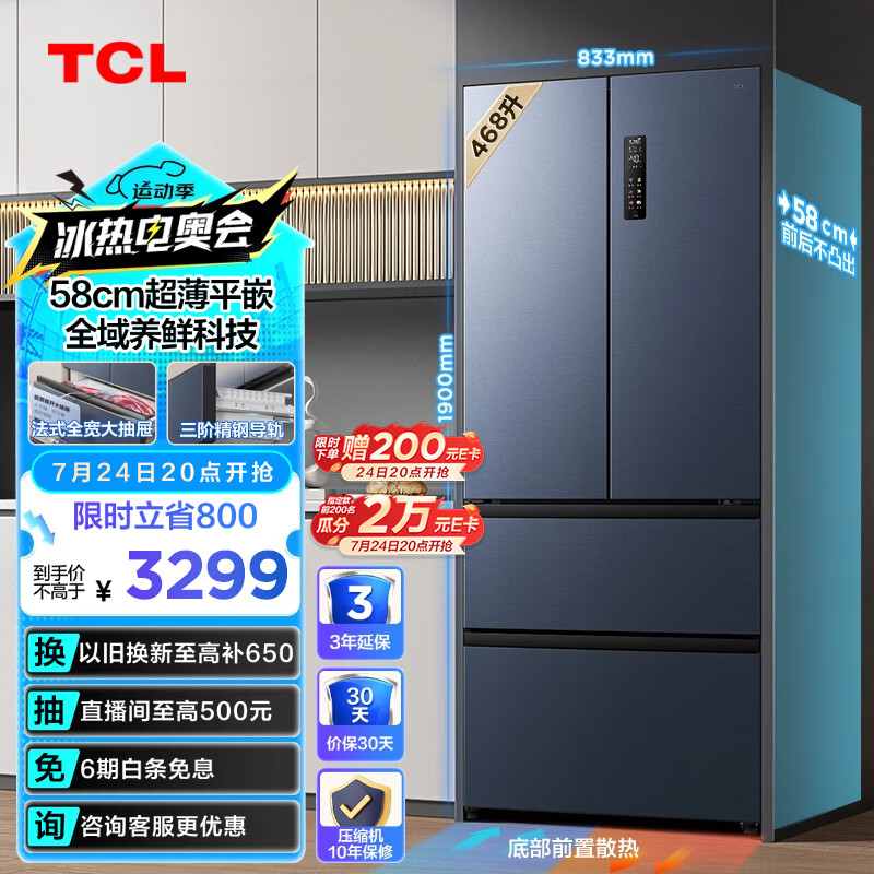 TCL 468升T9超薄平嵌法式四开门58cm嵌入式冰箱杀菌除味双循环一级能效风冷无霜家用电冰箱R468T9-DQ价格:3799.00元!
