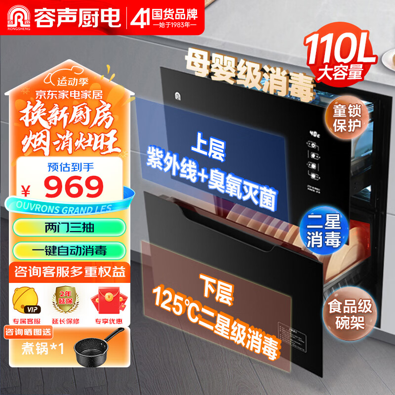 容声(RONGSHENG) 消毒柜家用嵌入式 三层二 高温臭氧 厨房碗筷消毒柜 110L大容量RX02R价格:969.00元!