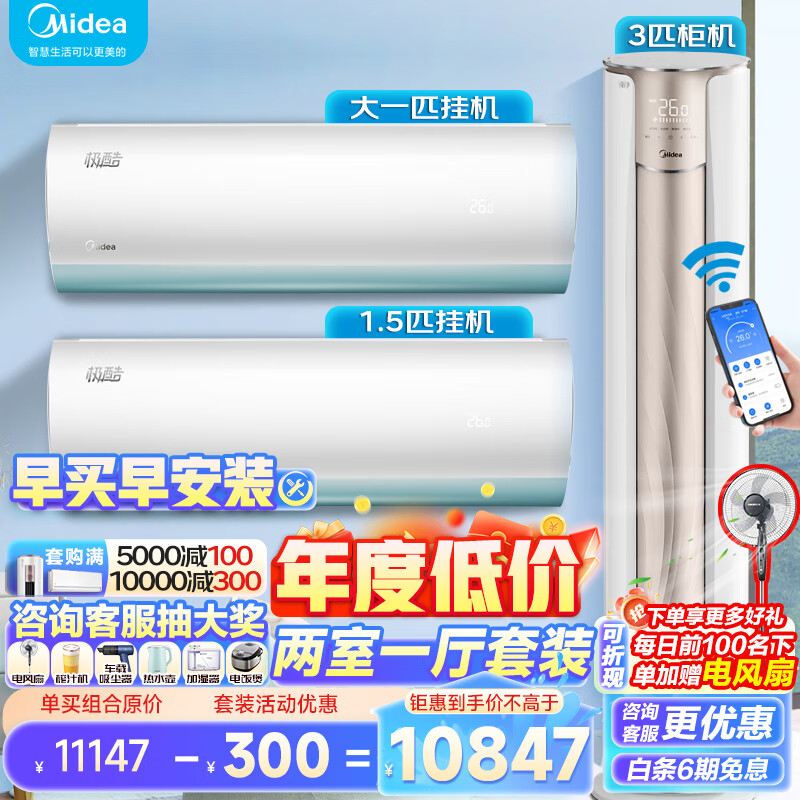 美的(Midea)空调 新一级能效 锐静柜机 极酷挂机 空调套装 两室一厅(3匹+1.5匹+大1匹)价格:10397.00元!