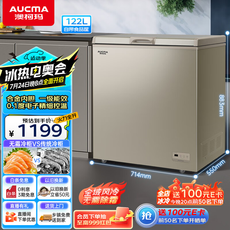澳柯玛(AUCMA)122升风冷无霜冰柜家用商用单温冷藏柜冷冻柜母乳小冰柜商用小型冷柜冰箱BC/BD-122WD以旧换新价格:1199.00元!