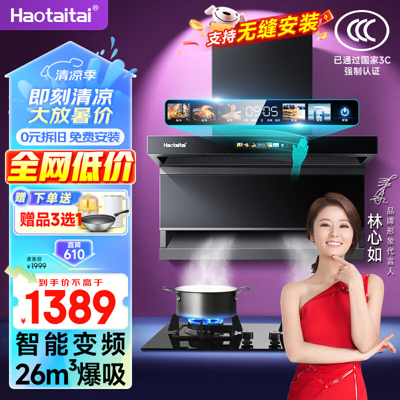 Haotaitai顶侧双吸油烟机 7字型 家用26立方大吸力抽油烟机套装 免拆自清洗 静音变频款FJ9-BP价格:1399.00元!