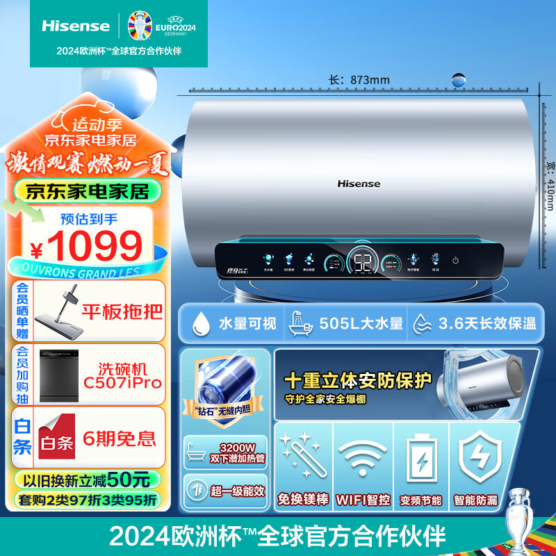 海信(Hisense)60升家用电热水器3200W变频速热一级能效镁棒免更换钻石无缝内胆大屏WIFI智能C509i智享以旧换新价格:1099.00元!