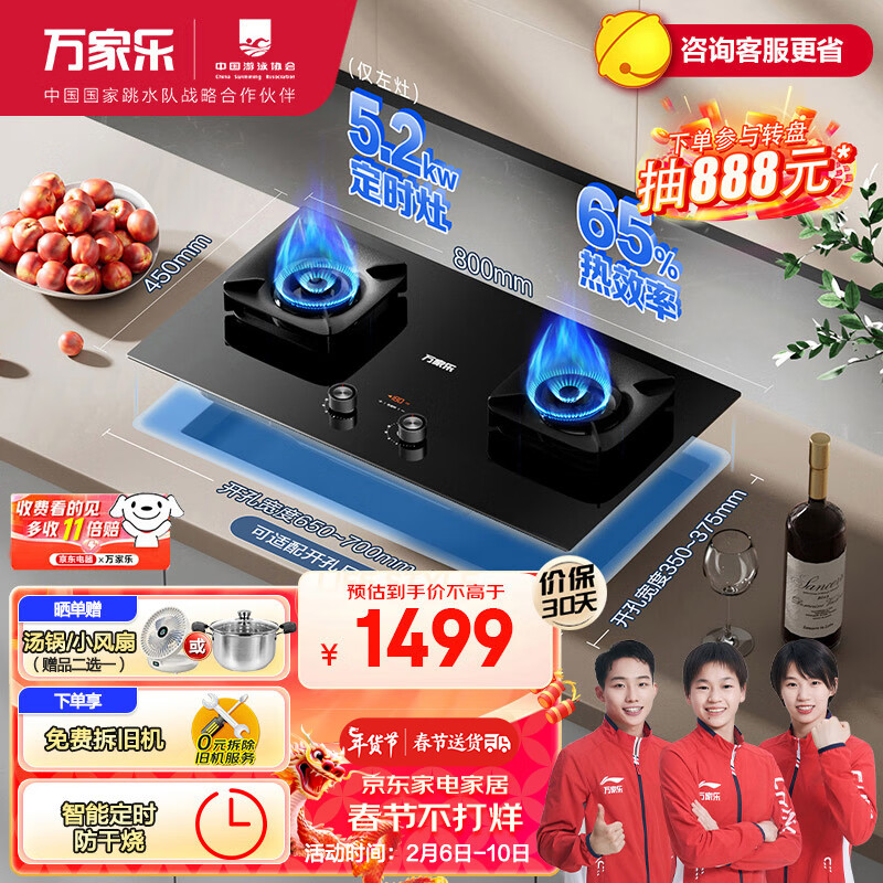 万家乐燃气灶天然气灶5.2kW猛火灶 家用智能防干烧定时三防灶台嵌两用全进风铜火盖可拆炉头灶具JZT-AC7A价格:1499.00元!