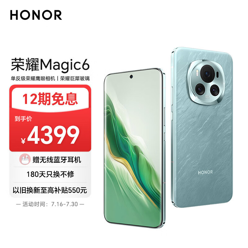 荣耀Magic6 单反级荣耀鹰眼相机 荣耀巨犀玻璃 第三代骁龙8芯片 16GB+256GB 海湖青 5G AI手机价格:4399.00元!