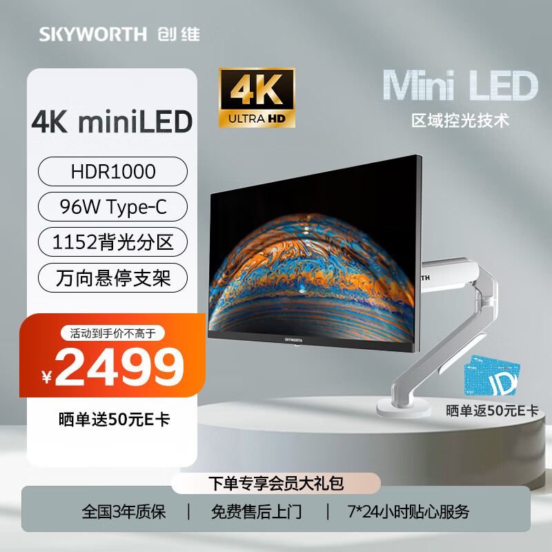 创维 27英寸 MiniLED显示器 4K 10.7亿色数 96W Type-C 1152分区 万向支架 办公显示器 F27D60U Pro价格:3499.00元!