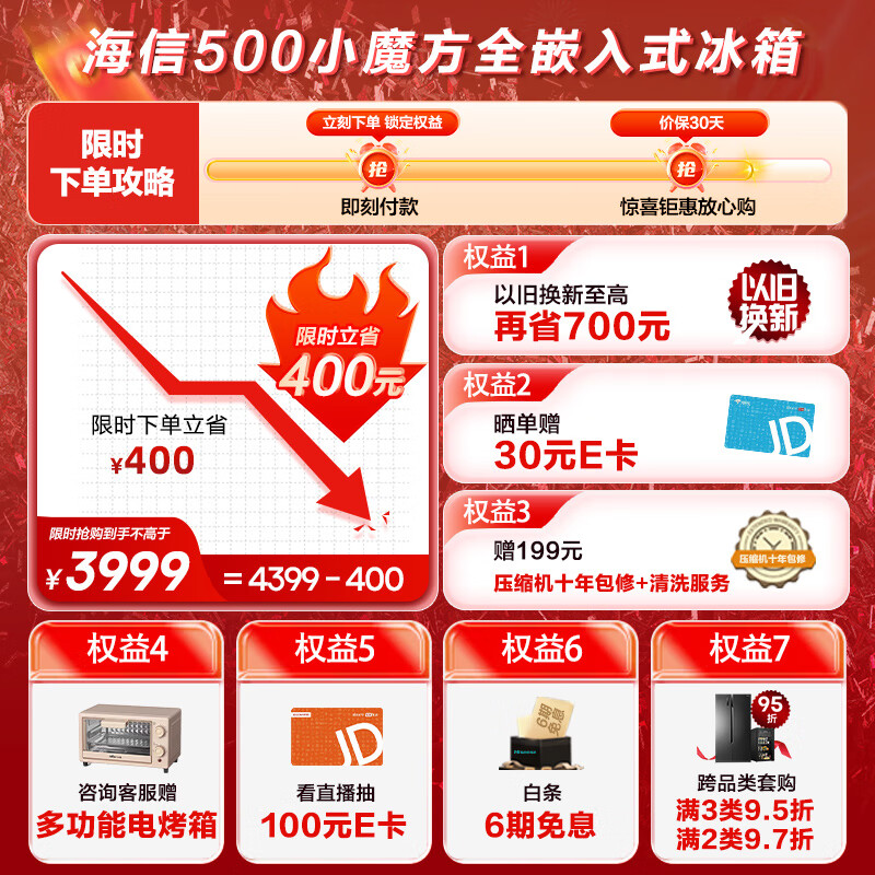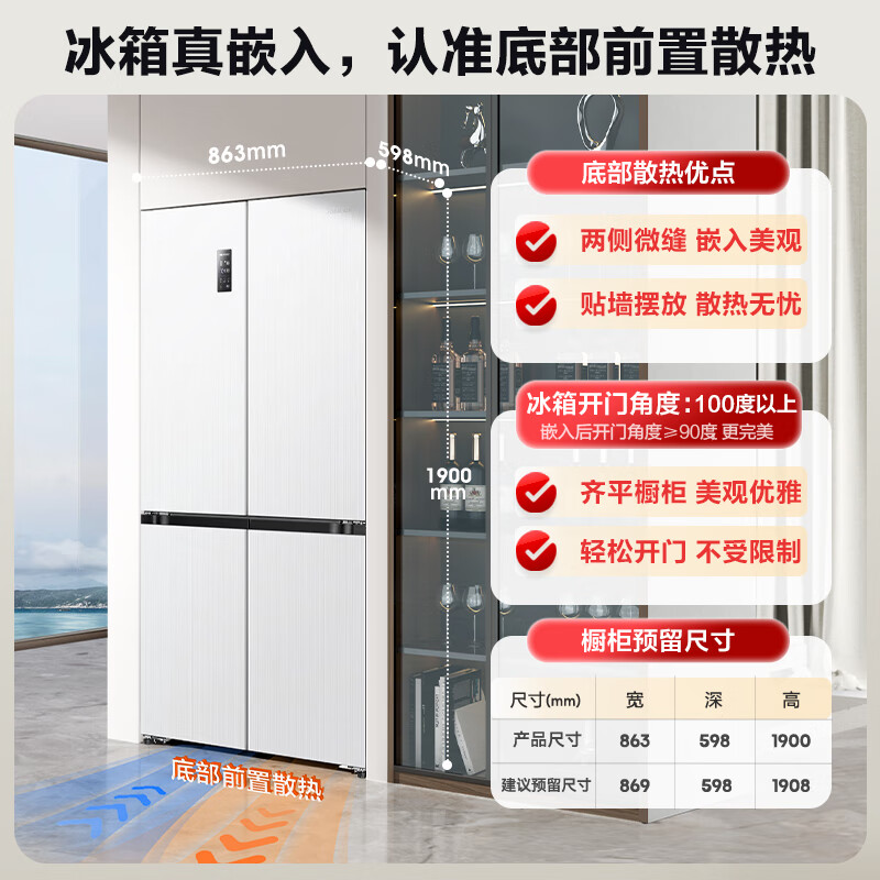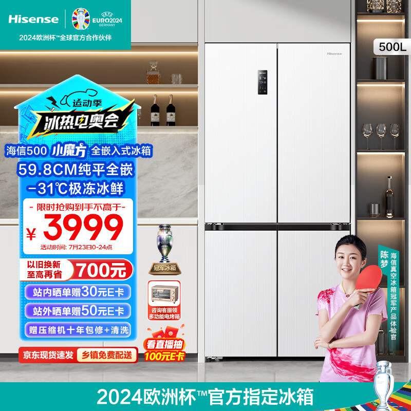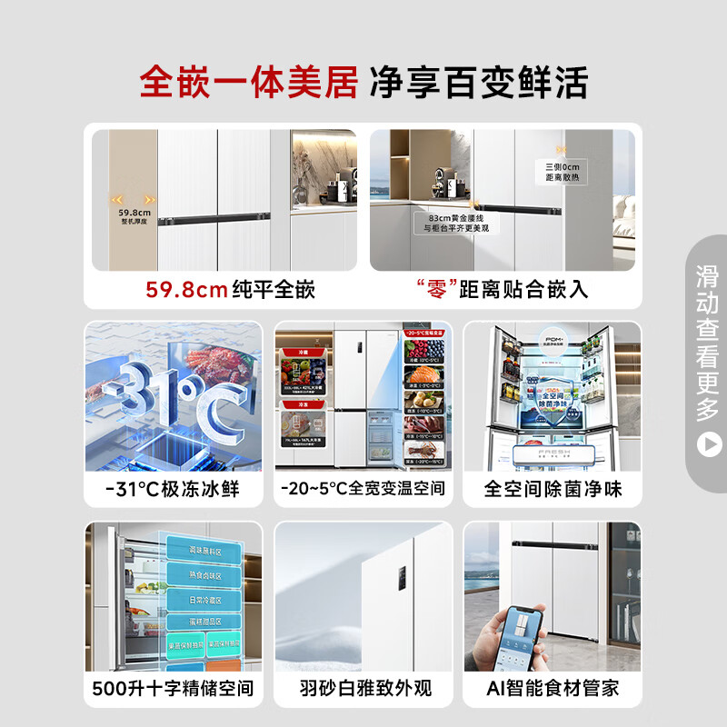 海信(Hisense)500小魔方1.0全嵌入式冰箱四开门60cm零嵌平嵌十字一级能效双变频BCD-500WMK1PU战神系列冰箱价格:4399.00元!