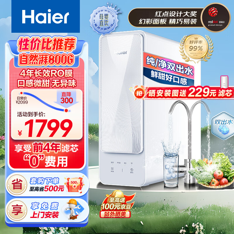 海尔(Haier)自然湃家用净水器800G 厨下RO反渗透过滤直饮水纯水机 双出水无双酚A HRO8H88-2U1价格:1799.00元!