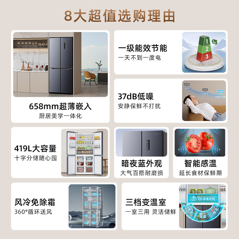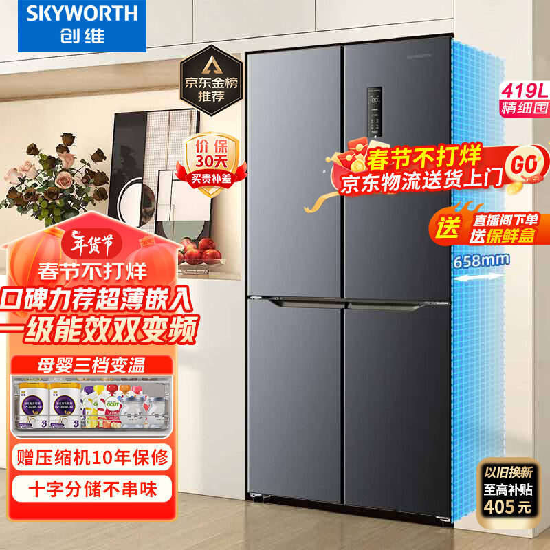创维(SKYWORTH)四维鲜净419升风冷十字对开门四开门家用电冰箱一级能效变频超薄嵌入BCD-419WXPS(N)价格:1799.00元!