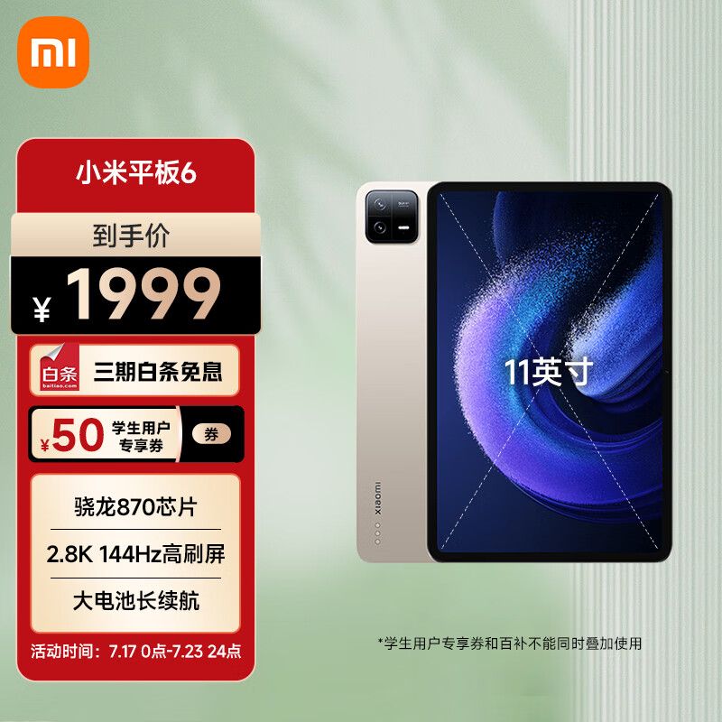 小米平板6 xiaomiPad 11英寸 骁龙870 144Hz高刷2.8K超清 8+256GB 会议笔记移动办公娱乐平板电脑金色价格:1999.00元!