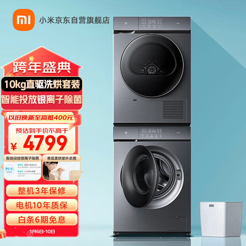 米家小米出品 洗烘套装10kg滚筒洗衣机全自动+10kg热泵烘干机 直驱变频XQG100MJ102S+H100MJ102S价格:4799.00元!