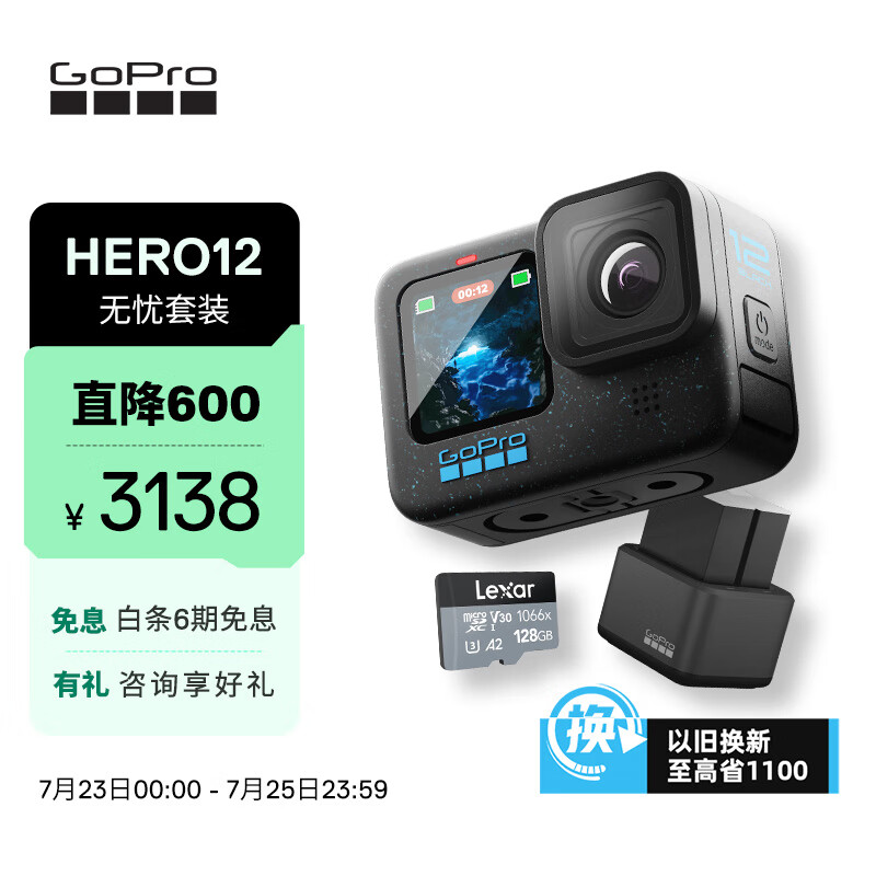 GoPro HERO12 Black防抖运动相机 增强续航 防水相机 vlog潜水滑雪摄影摄像【单机+增强双充+128G】价格:3138.00元!