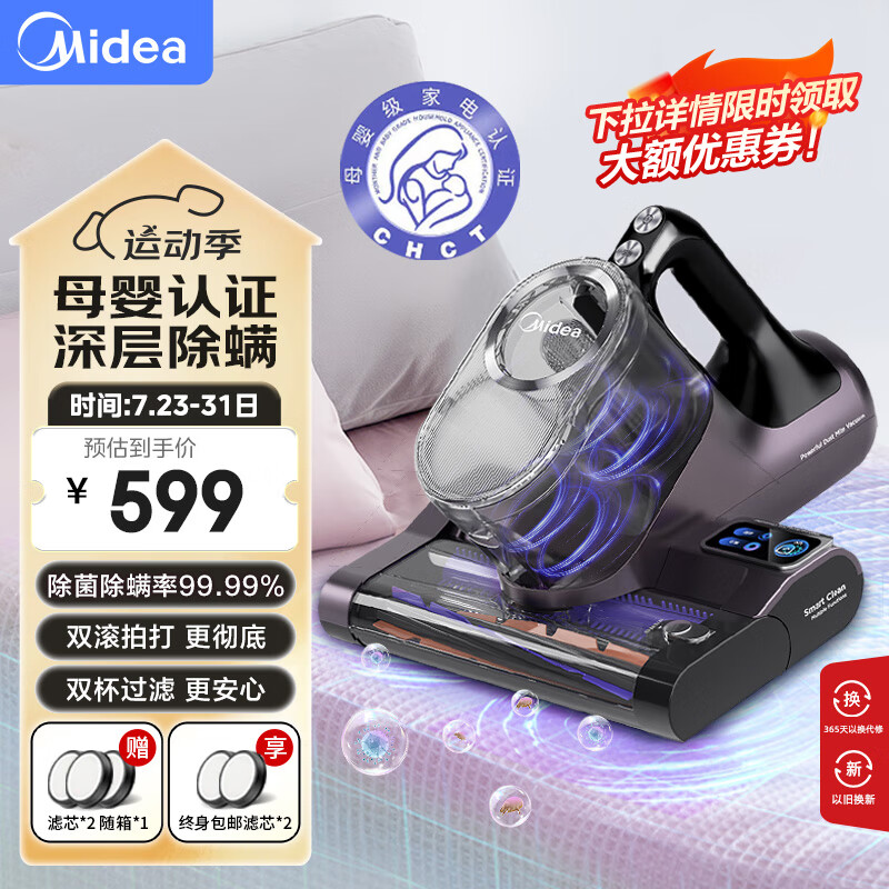 美的(Midea)除螨仪 双杯尘螨分离 家用床上紫外线杀菌除螨机 双滚刷高频拍打吸尘除螨一体机 MC6小旋风价格:599.00元!