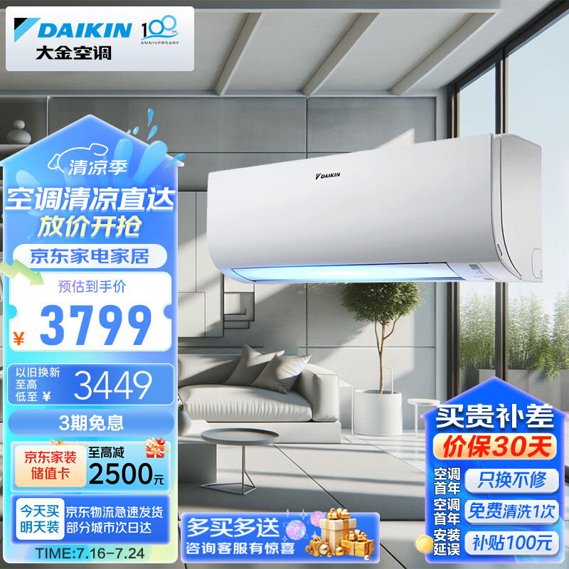 大金空调 14-19㎡适用 新三级能效 大1.5匹 变频 冷暖 家用 壁挂式 以旧换新 FTXJ336WC-W价格:3899.00元!