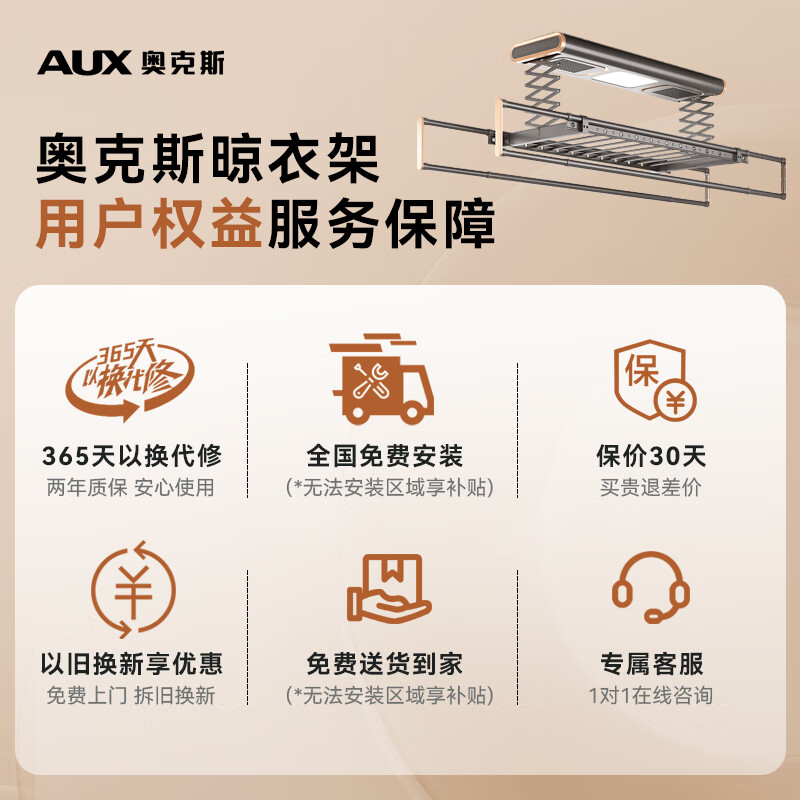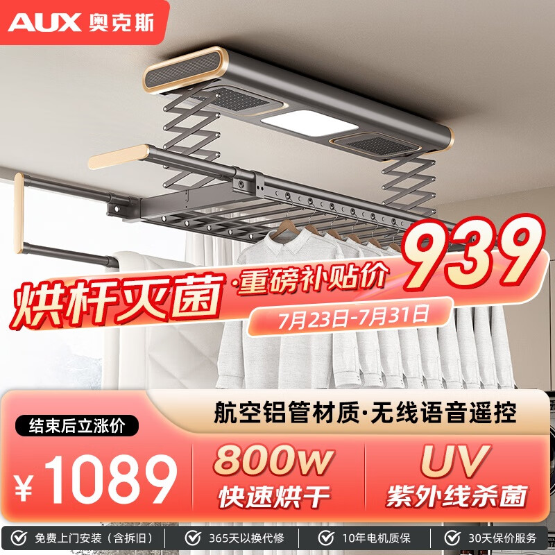 奥克斯(AUX)电动晾衣架智能升级全功能款阳台室外遥控语音照明风干烘干机灰价格:1089.00元!