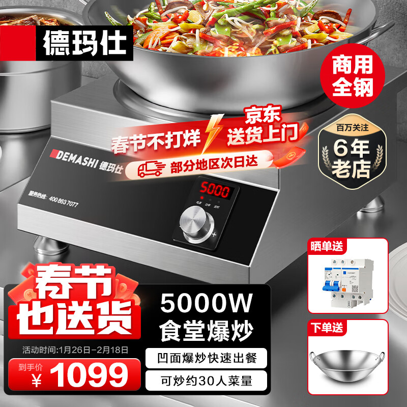 德玛仕(DEMASHI)大功率商用电磁炉 凹面电磁炉猛火爆炒5000w电磁灶 全不锈钢凹槽电炒锅IH-TC-5000N【220V】价格:1099.00元!