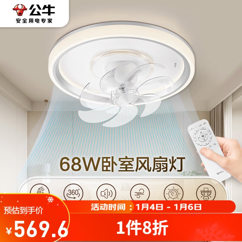公牛(BULL)卧室风扇灯GF08BZ自然风360°灵活摇头六档风力无极调光68W带遥控价格:712.00元!